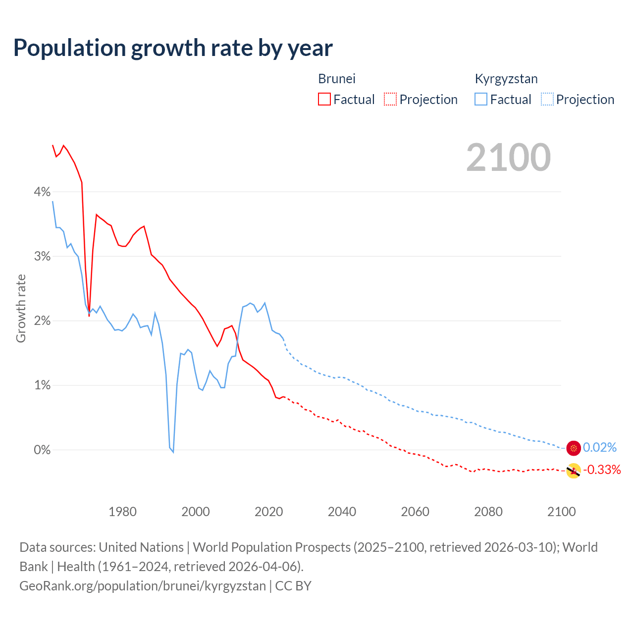- For the last 10 years, Brunei has had an average growth rate of +1.08% per year vs +2.05% in Kyrgyzstan.