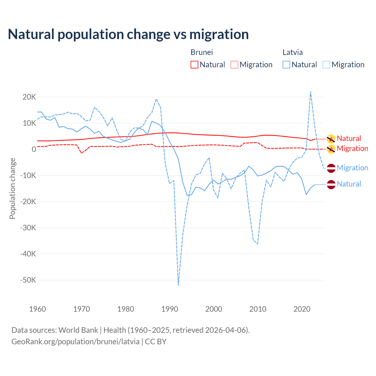 Over the last 10 years, 93.9% of the population change in Brunei is from natural causes (a gain of 43,993 people) and 6.15% is from migration (a gain of 2,882 people). In Latvia 82.7% is from natural causes (a loss of 103,711 people) and 17.3% is from migration (a loss of 21,641 people).