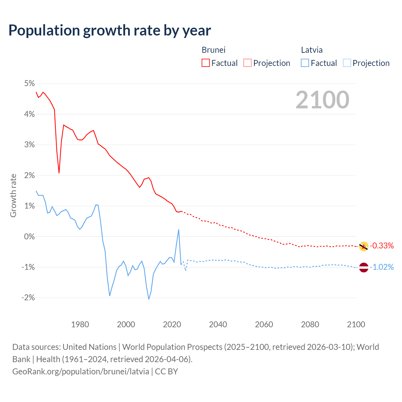 - For the last 10 years, Brunei has had an average growth rate of +1.08% per year vs -0.68% in Latvia.