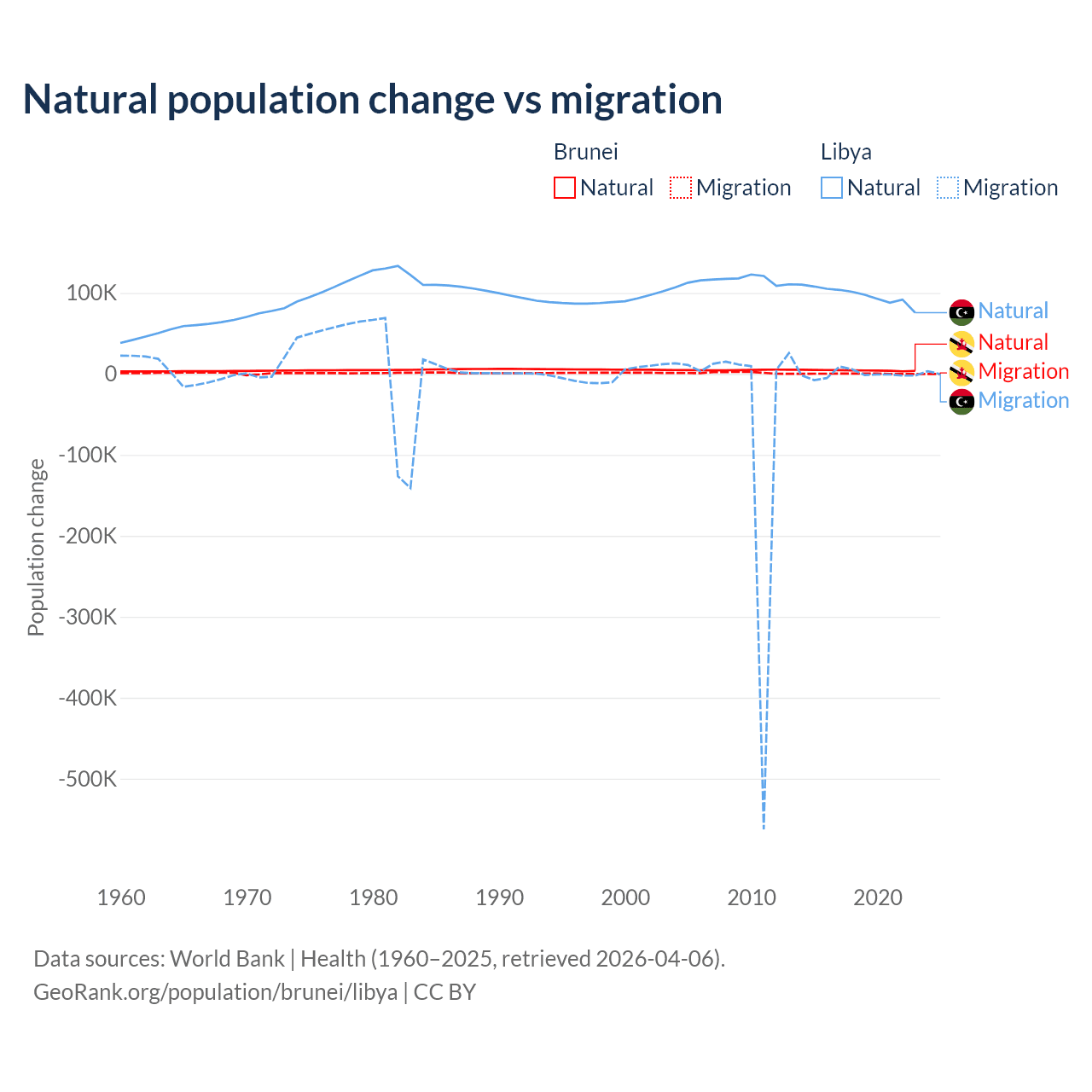 Over the last 10 years, 93.9% of the population change in Brunei is from natural causes (a gain of 43,993 people) and 6.15% is from migration (a gain of 2,882 people). In Libya 99.4% is from natural causes (a gain of 975,799 people) and 0.63% is from migration (a loss of 6,150 people).