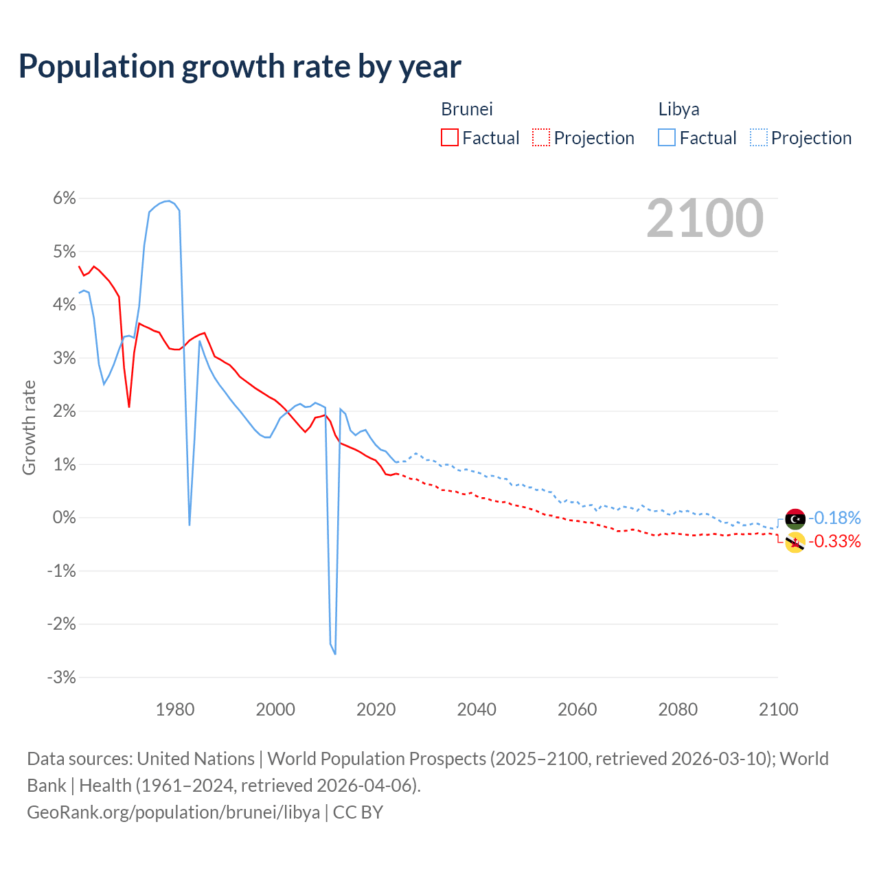 - For the last 10 years, Brunei has had an average growth rate of +1.08% per year vs +1.44% in Libya.