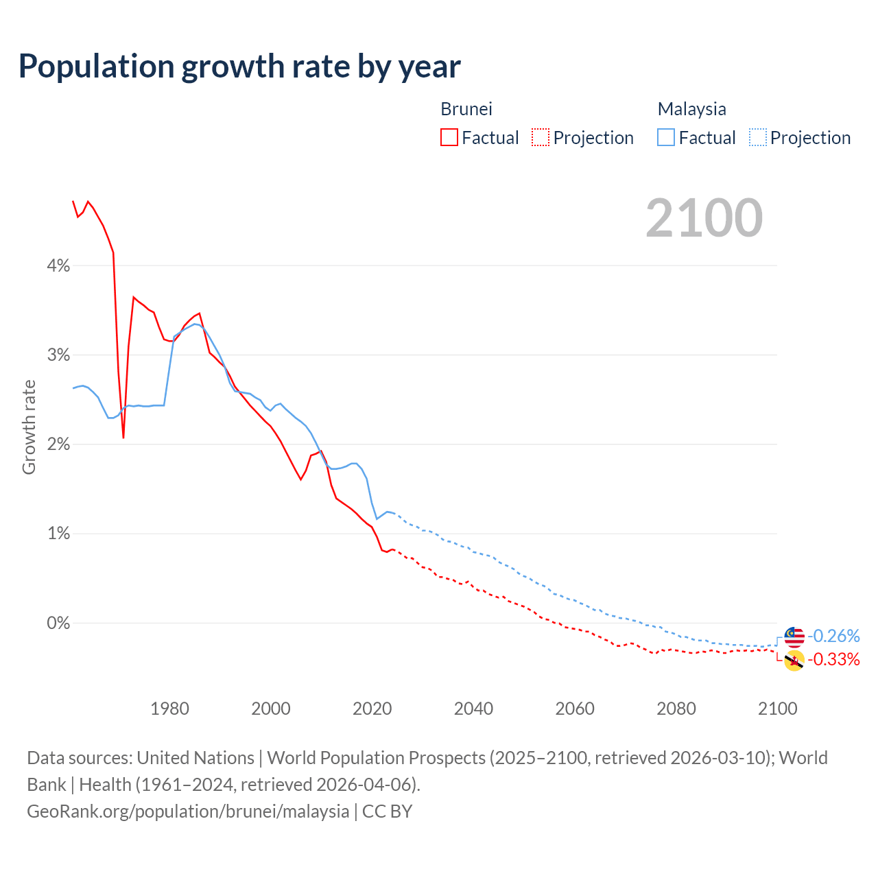 - For the last 10 years, Brunei has had an average growth rate of +1.08% per year vs +1.5% in Malaysia.