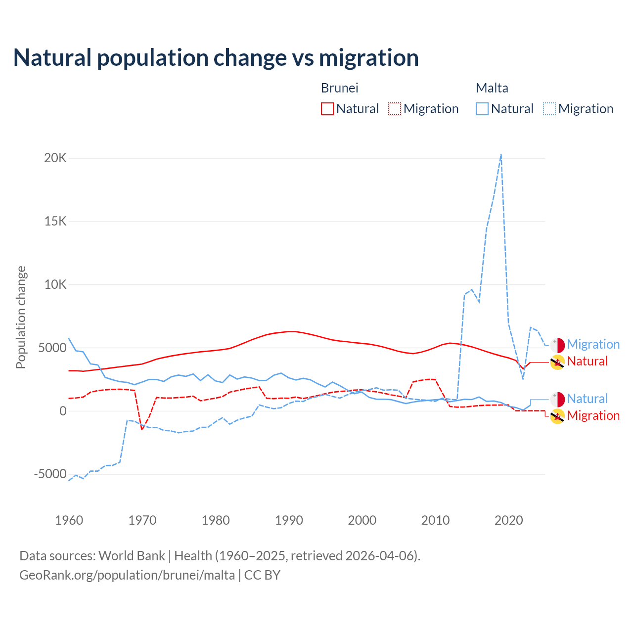 Over the last 10 years, 93.9% of the population change in Brunei is from natural causes (a gain of 43,993 people) and 6.15% is from migration (a gain of 2,882 people). In Malta 5.84% is from natural causes (a gain of 6,181 people) and 94.2% is from migration (a gain of 99,652 people).
