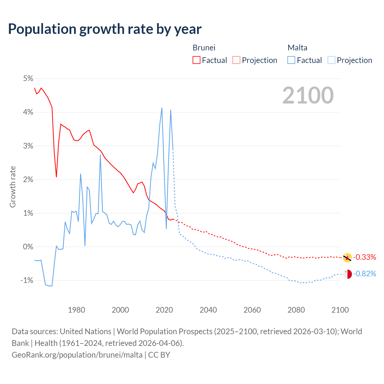 - For the last 10 years, Brunei has had an average growth rate of +1.08% per year vs +2.69% in Malta.