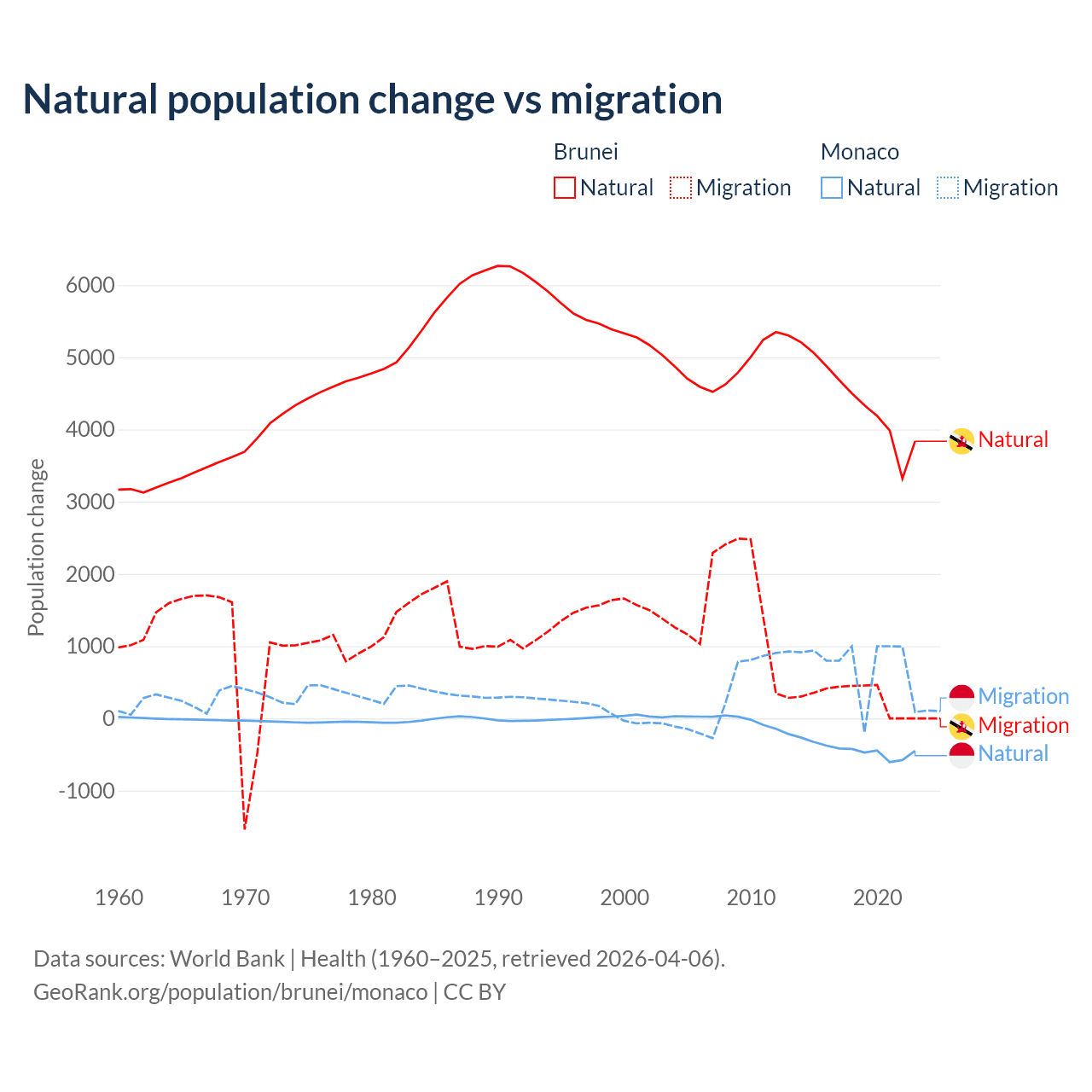 Over the last 10 years, 93.9% of the population change in Brunei is from natural causes (a gain of 43,993 people) and 6.15% is from migration (a gain of 2,882 people). In Monaco 37.3% is from natural causes (a loss of 4,357 people) and 62.7% is from migration (a gain of 7,333 people).