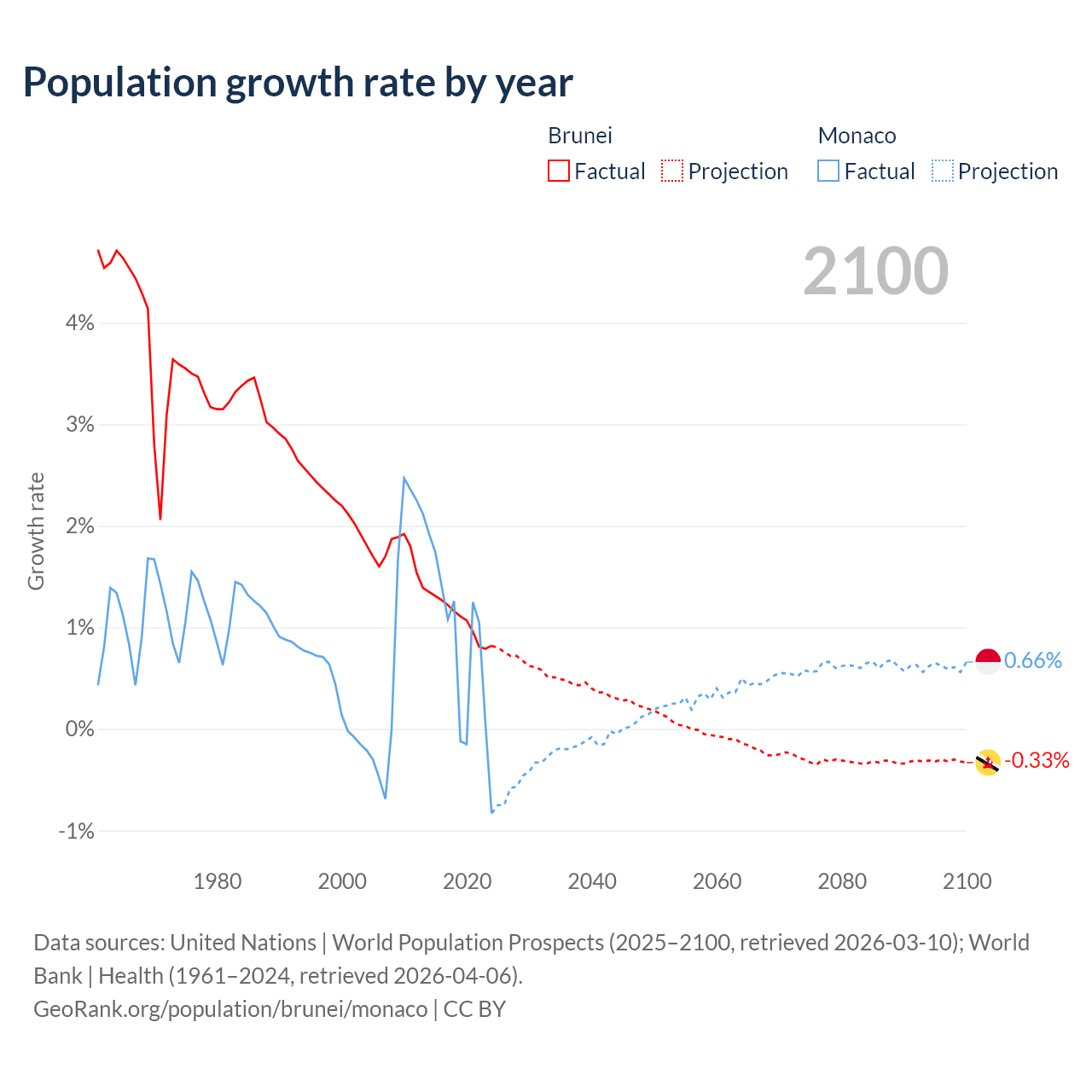 - For the last 10 years, Brunei has had an average growth rate of +1.08% per year vs +0.79% in Monaco.