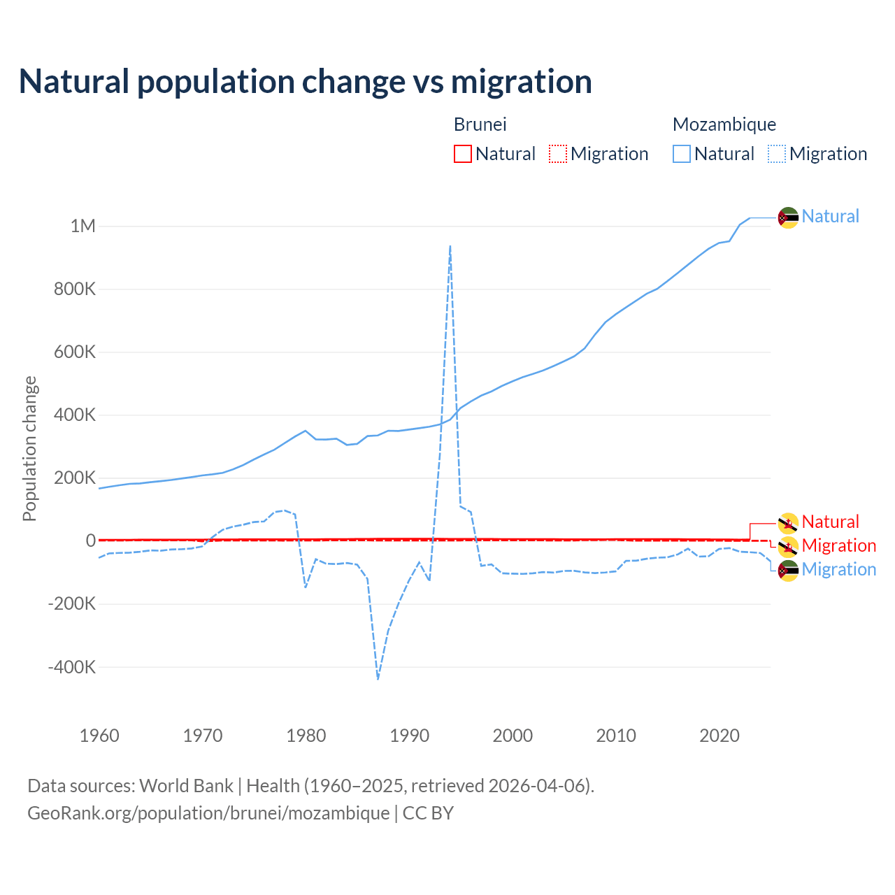 Over the last 10 years, 93.9% of the population change in Brunei is from natural causes (a gain of 43,993 people) and 6.15% is from migration (a gain of 2,882 people). In Mozambique 95.9% is from natural causes (a gain of 9,108,203 people) and 4.15% is from migration (a loss of 393,923 people).