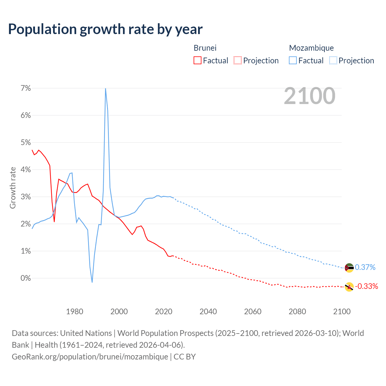 - For the last 10 years, Brunei has had an average growth rate of +1.08% per year vs +2.99% in Mozambique.