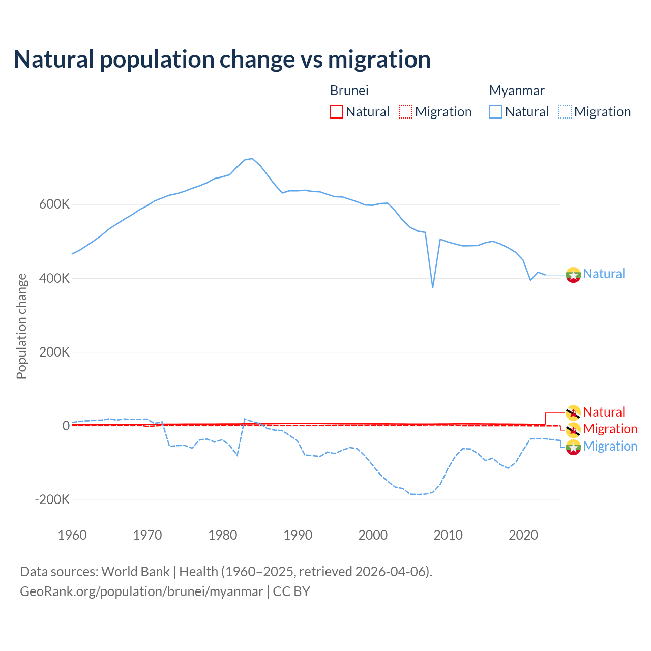 Over the last 10 years, 93.9% of the population change in Brunei is from natural causes (a gain of 43,993 people) and 6.15% is from migration (a gain of 2,882 people). In Myanmar 86% is from natural causes (a gain of 4,594,615 people) and 14% is from migration (a loss of 749,272 people).