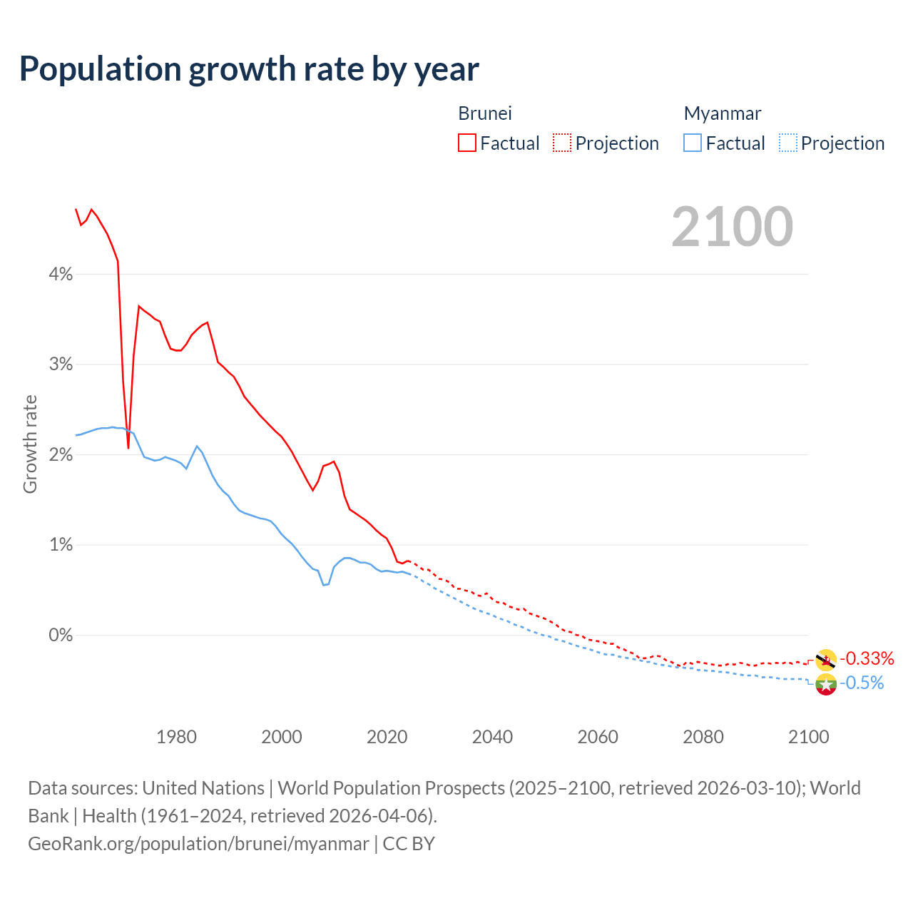 - For the last 10 years, Brunei has had an average growth rate of +1.08% per year vs +0.74% in Myanmar.