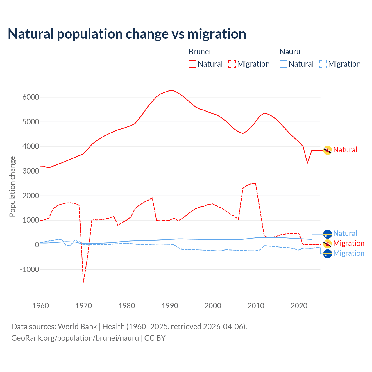 Over the last 10 years, 93.9% of the population change in Brunei is from natural causes (a gain of 43,993 people) and 6.15% is from migration (a gain of 2,882 people). In Nauru 66.2% is from natural causes (a gain of 2,590 people) and 33.8% is from migration (a loss of 1,320 people).