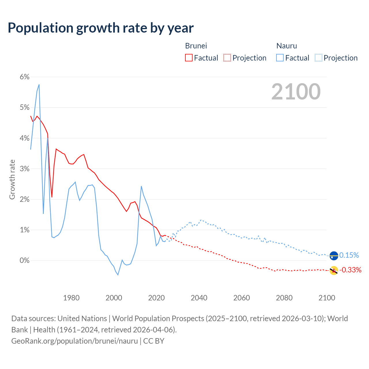- For the last 10 years, Brunei has had an average growth rate of +1.08% per year vs +1.17% in Nauru.