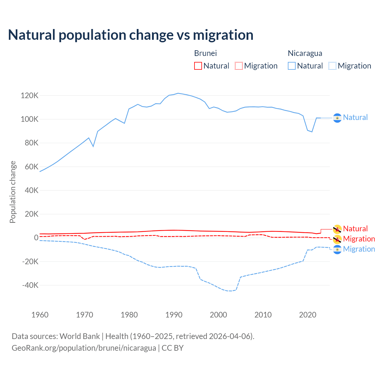 Over the last 10 years, 93.9% of the population change in Brunei is from natural causes (a gain of 43,993 people) and 6.15% is from migration (a gain of 2,882 people). In Nicaragua 85.5% is from natural causes (a gain of 1,017,084 people) and 14.5% is from migration (a loss of 172,078 people).