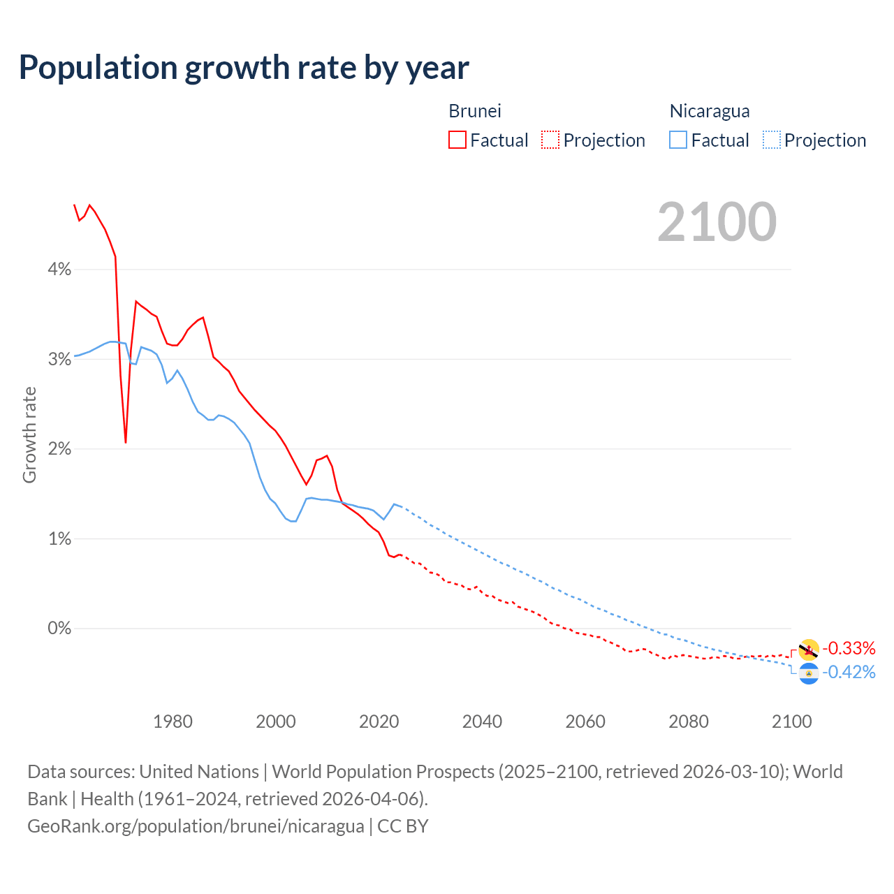 - For the last 10 years, Brunei has had an average growth rate of +1.08% per year vs +1.33% in Nicaragua.