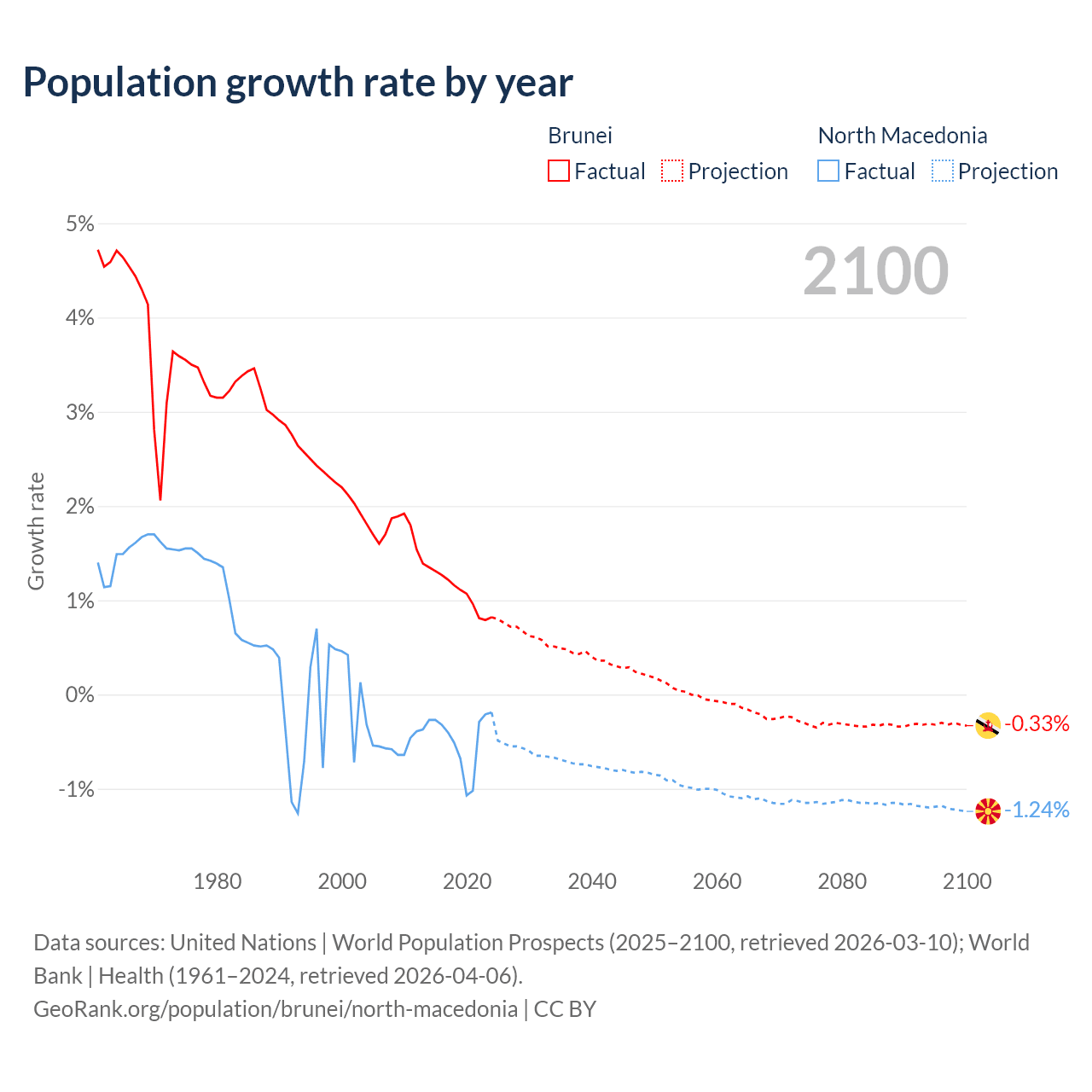 - For the last 10 years, Brunei has had an average growth rate of +1.08% per year vs -0.48% in North Macedonia.