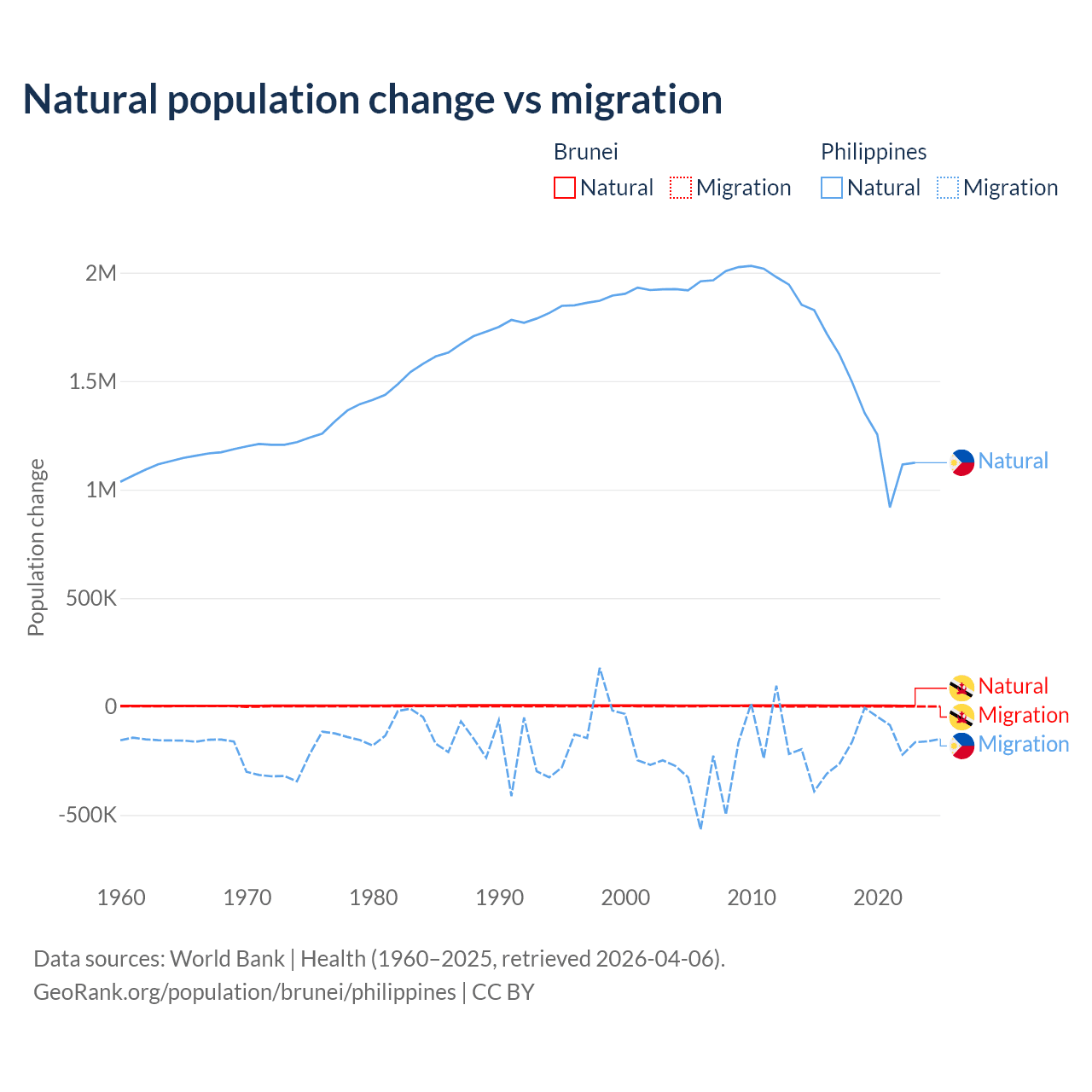 Over the last 10 years, 93.9% of the population change in Brunei is from natural causes (a gain of 43,993 people) and 6.15% is from migration (a gain of 2,882 people). In the Philippines 88.5% is from natural causes (a gain of 14,279,705 people) and 11.5% is from migration (a loss of 1,848,117 people).