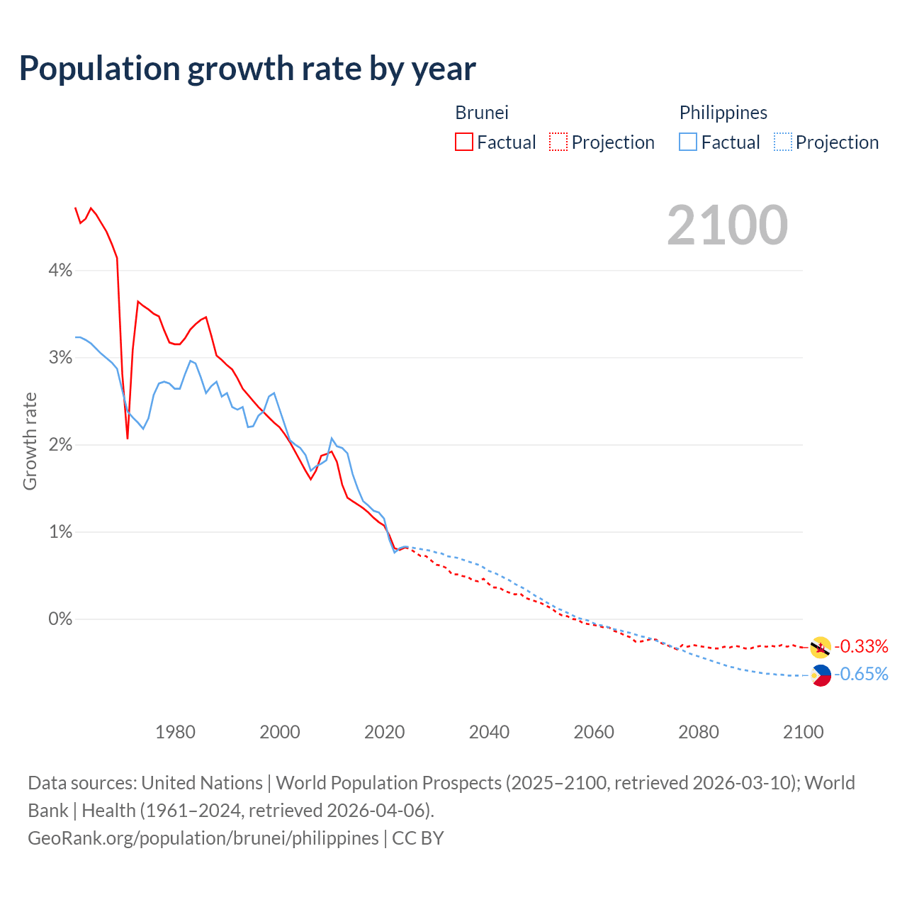 - For the last 10 years, Brunei has had an average growth rate of +1.08% per year vs +1.16% in the Philippines.