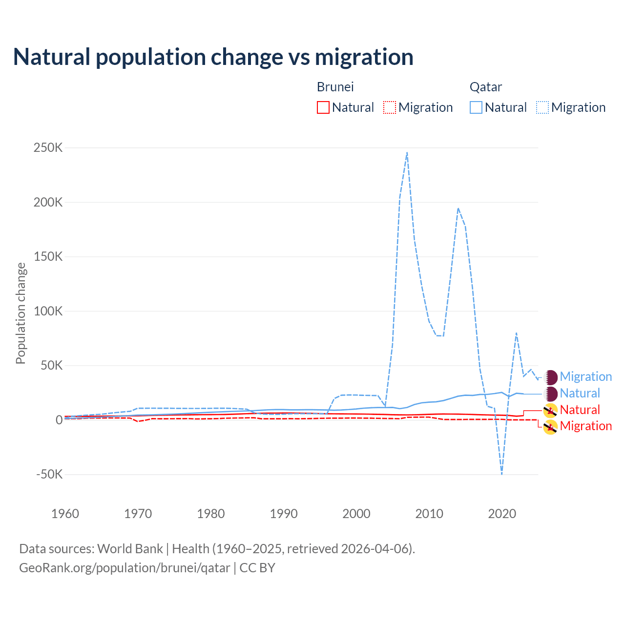 Over the last 10 years, 93.9% of the population change in Brunei is from natural causes (a gain of 43,993 people) and 6.15% is from migration (a gain of 2,882 people). In Qatar 26.1% is from natural causes (a gain of 232,009 people) and 73.9% is from migration (a gain of 655,712 people).