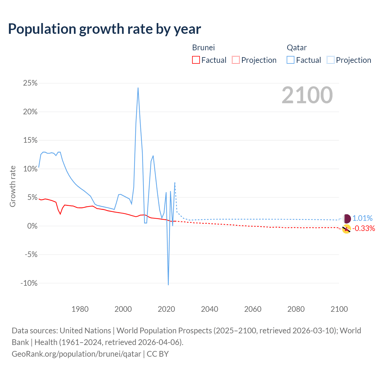 - For the last 10 years, Brunei has had an average growth rate of +1.08% per year vs +3.86% in Qatar.
