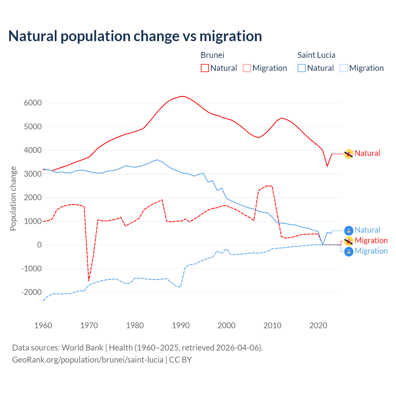 Over the last 10 years, 93.9% of the population change in Brunei is from natural causes (a gain of 43,993 people) and 6.15% is from migration (a gain of 2,882 people). In Saint Lucia 95.7% is from natural causes (a gain of 6,039 people) and 4.31% is from migration (a loss of 272 people).