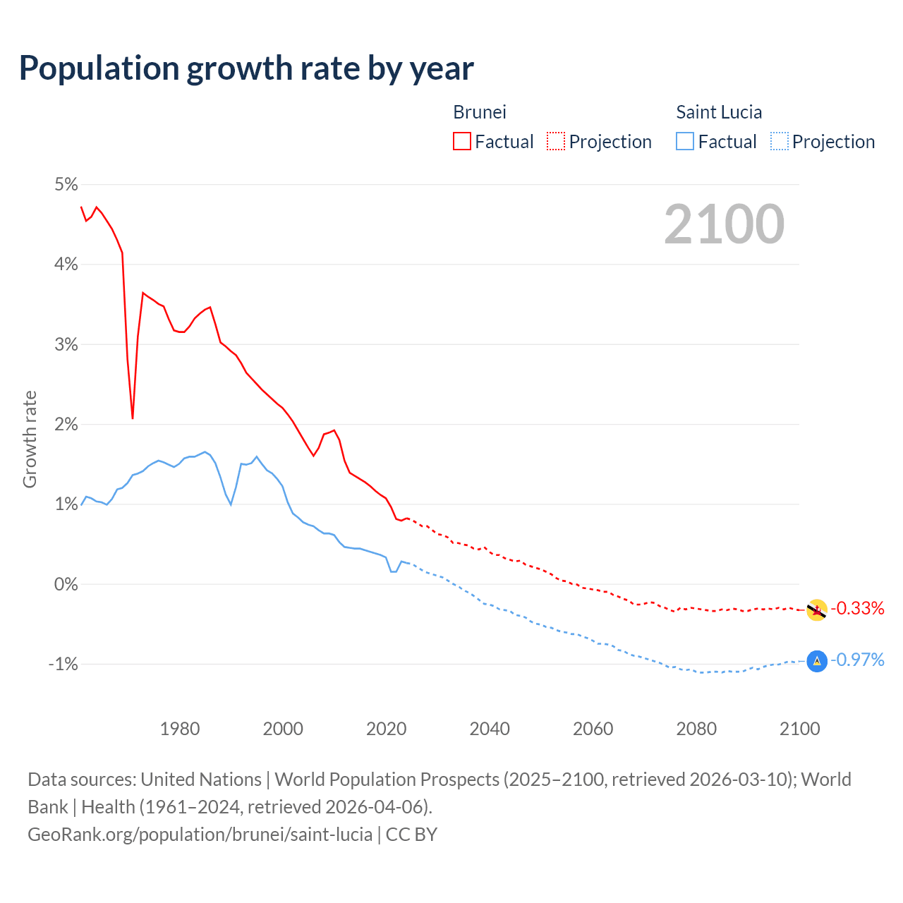 - For the last 10 years, Brunei has had an average growth rate of +1.08% per year vs +0.33% in Saint Lucia.