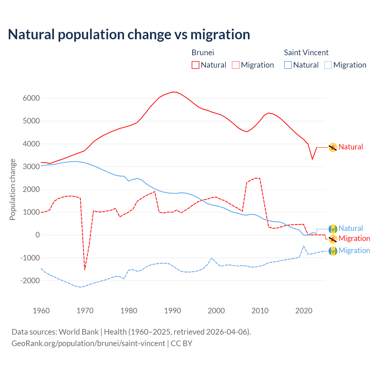 Over the last 10 years, 93.9% of the population change in Brunei is from natural causes (a gain of 43,993 people) and 6.15% is from migration (a gain of 2,882 people). In Saint Vincent 21.2% is from natural causes (a gain of 2,525 people) and 78.8% is from migration (a loss of 9,393 people).