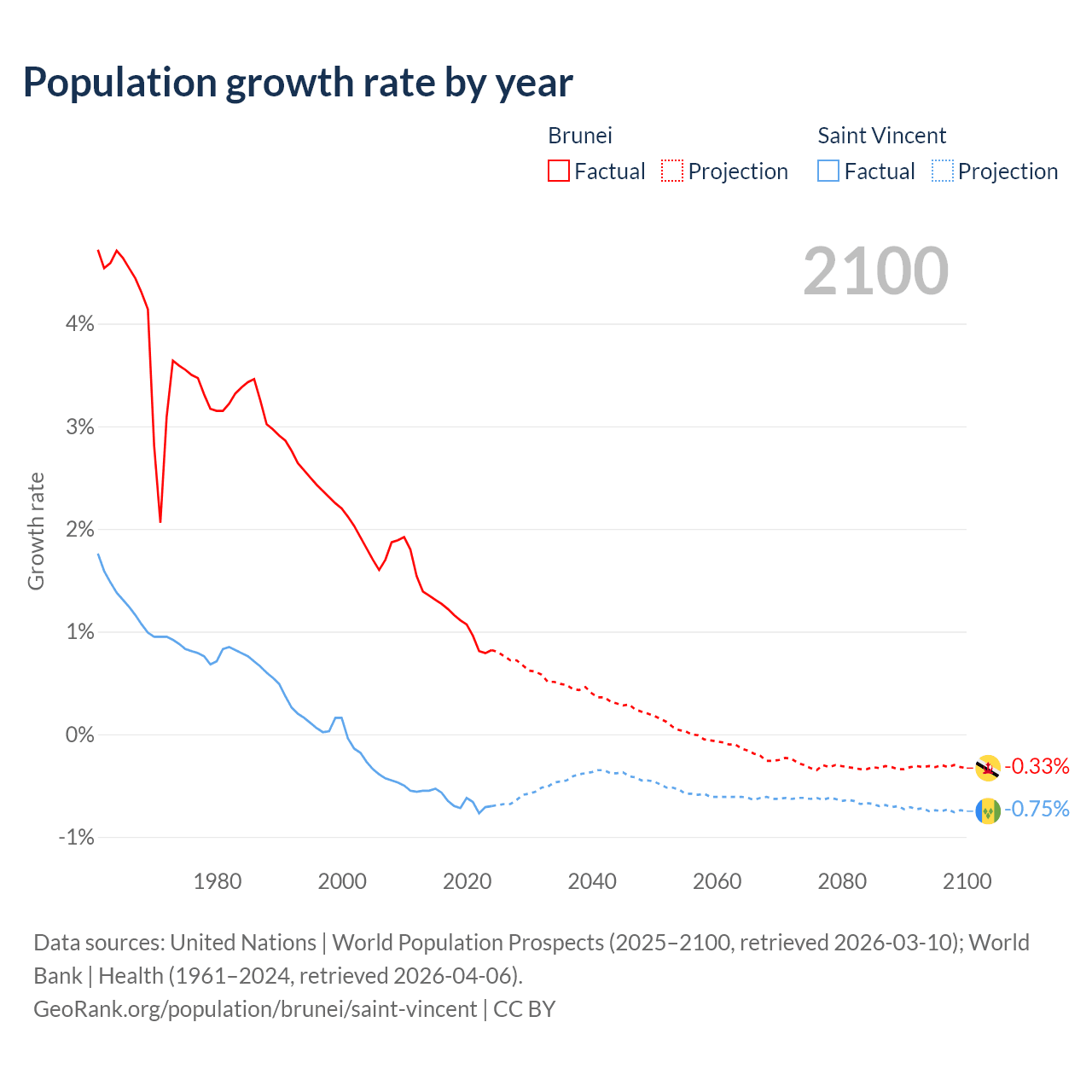 - For the last 10 years, Brunei has had an average growth rate of +1.08% per year vs -0.65% in Saint Vincent.