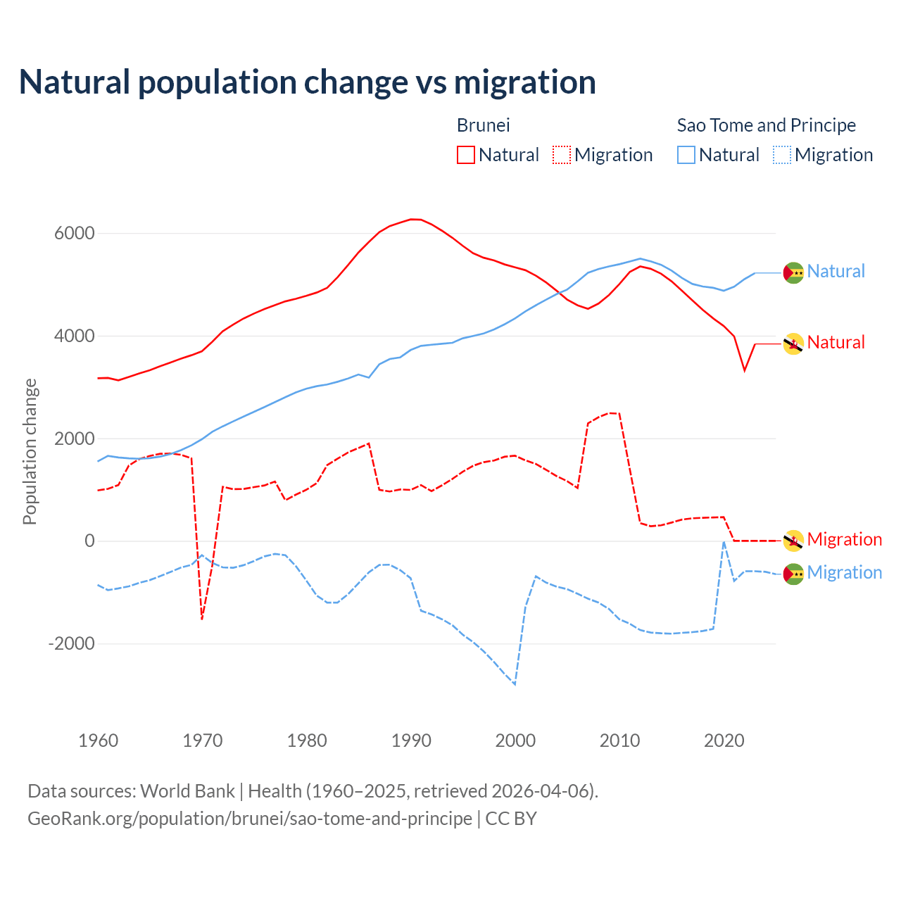 Over the last 10 years, 93.9% of the population change in Brunei is from natural causes (a gain of 43,993 people) and 6.15% is from migration (a gain of 2,882 people). In Sao Tome and Principe 80.1% is from natural causes (a gain of 50,822 people) and 19.9% is from migration (a loss of 12,621 people).