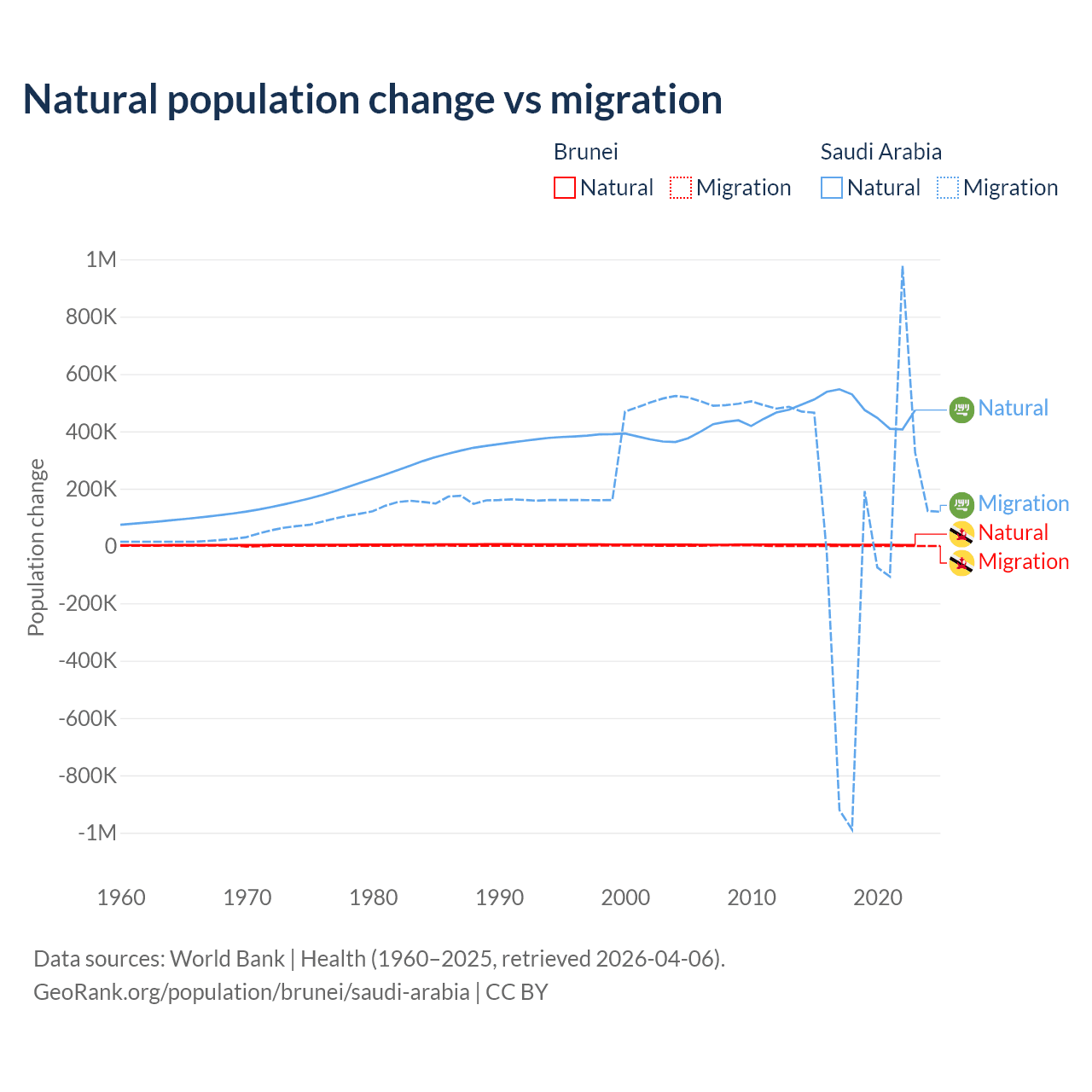 Over the last 10 years, 93.9% of the population change in Brunei is from natural causes (a gain of 43,993 people) and 6.15% is from migration (a gain of 2,882 people). In Saudi Arabia 93.9% is from natural causes (a gain of 4,829,562 people) and 6.05% is from migration (a gain of 311,209 people).