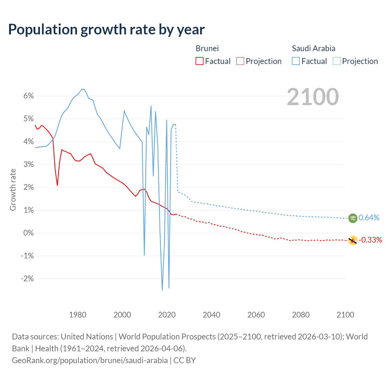 - For the last 10 years, Brunei has had an average growth rate of +1.08% per year vs +2.3% in Saudi Arabia.