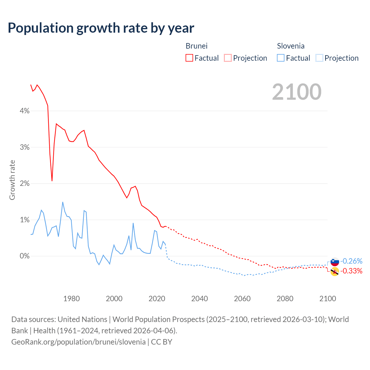 - For the last 10 years, Brunei has had an average growth rate of +1.08% per year vs +0.29% in Slovenia.