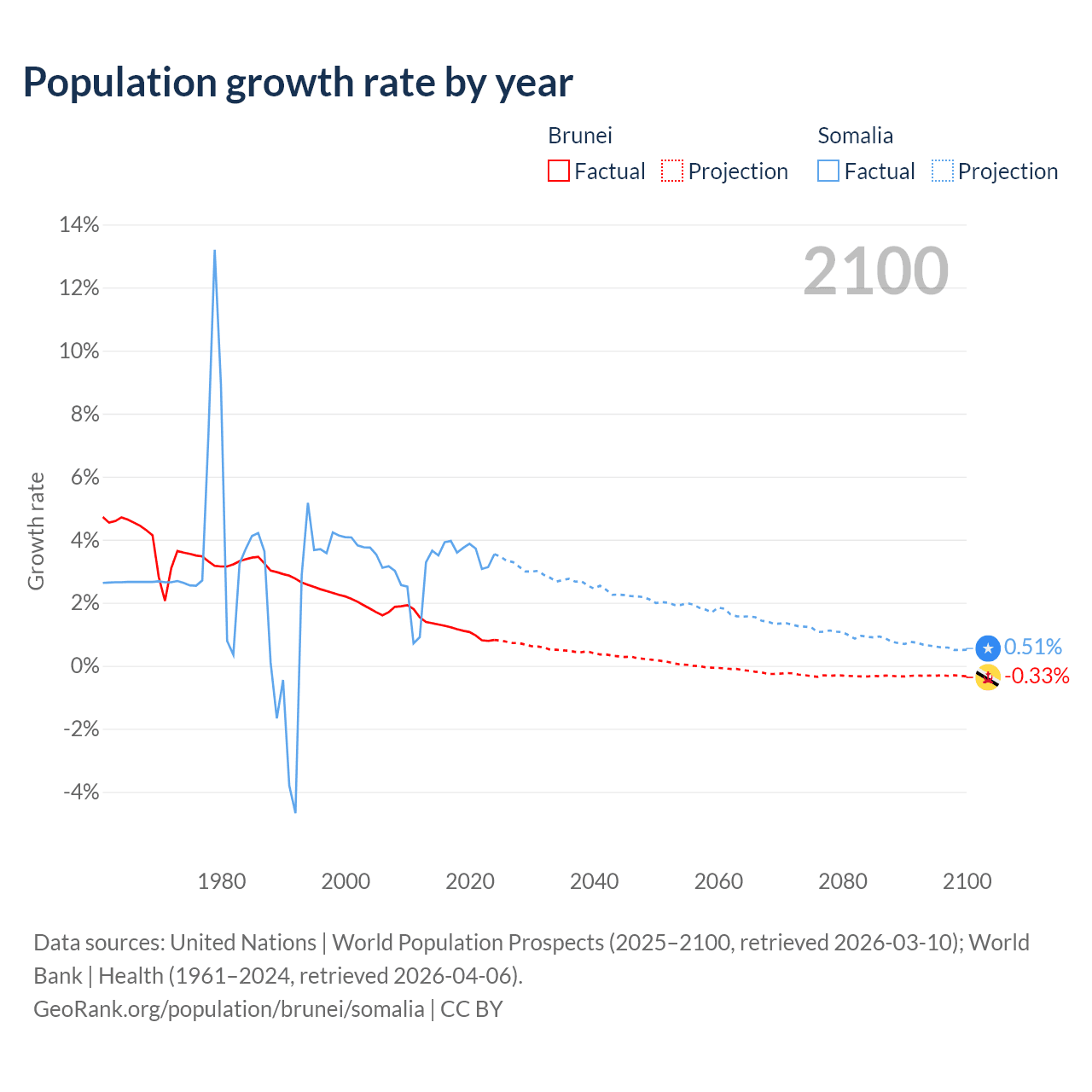 - For the last 10 years, Brunei has had an average growth rate of +1.08% per year vs +3.61% in Somalia.