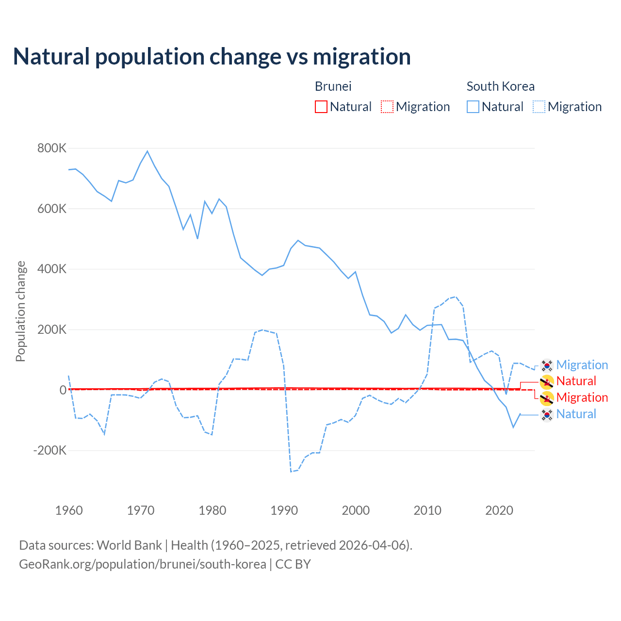 Over the last 10 years, 93.9% of the population change in Brunei is from natural causes (a gain of 43,993 people) and 6.15% is from migration (a gain of 2,882 people). In South Korea 17.6% is from natural causes (a gain of 277,215 people) and 82.4% is from migration (a gain of 1,298,356 people).