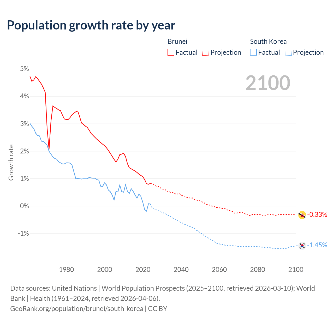 - For the last 10 years, Brunei has had an average growth rate of +1.08% per year vs +0.24% in South Korea.