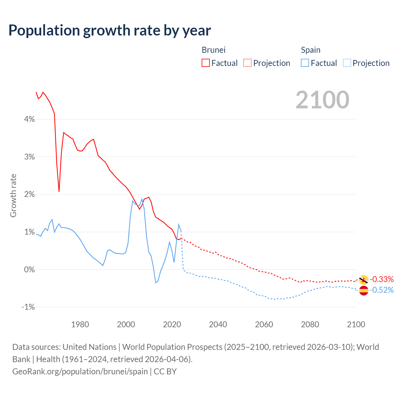 - For the last 10 years, Brunei has had an average growth rate of +1.08% per year vs +0.43% in Spain.