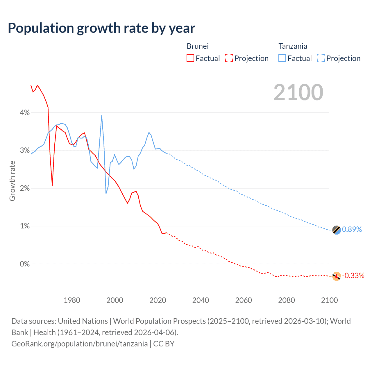 - For the last 10 years, Brunei has had an average growth rate of +1.08% per year vs +3.13% in Tanzania.
