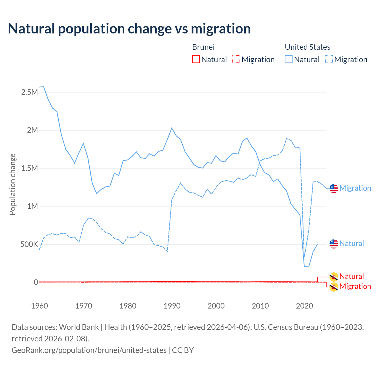 Over the last 10 years, 93.9% of the population change in Brunei is from natural causes (a gain of 43,993 people) and 6.15% is from migration (a gain of 2,882 people). In the United States 35.8% is from natural causes (a gain of 8,005,866 people) and 64.2% is from migration (a gain of 14,334,286 people).