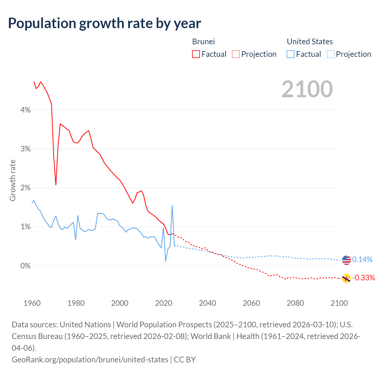 - For the last 10 years, Brunei has had an average growth rate of +1.08% per year vs +0.65% in the United States.