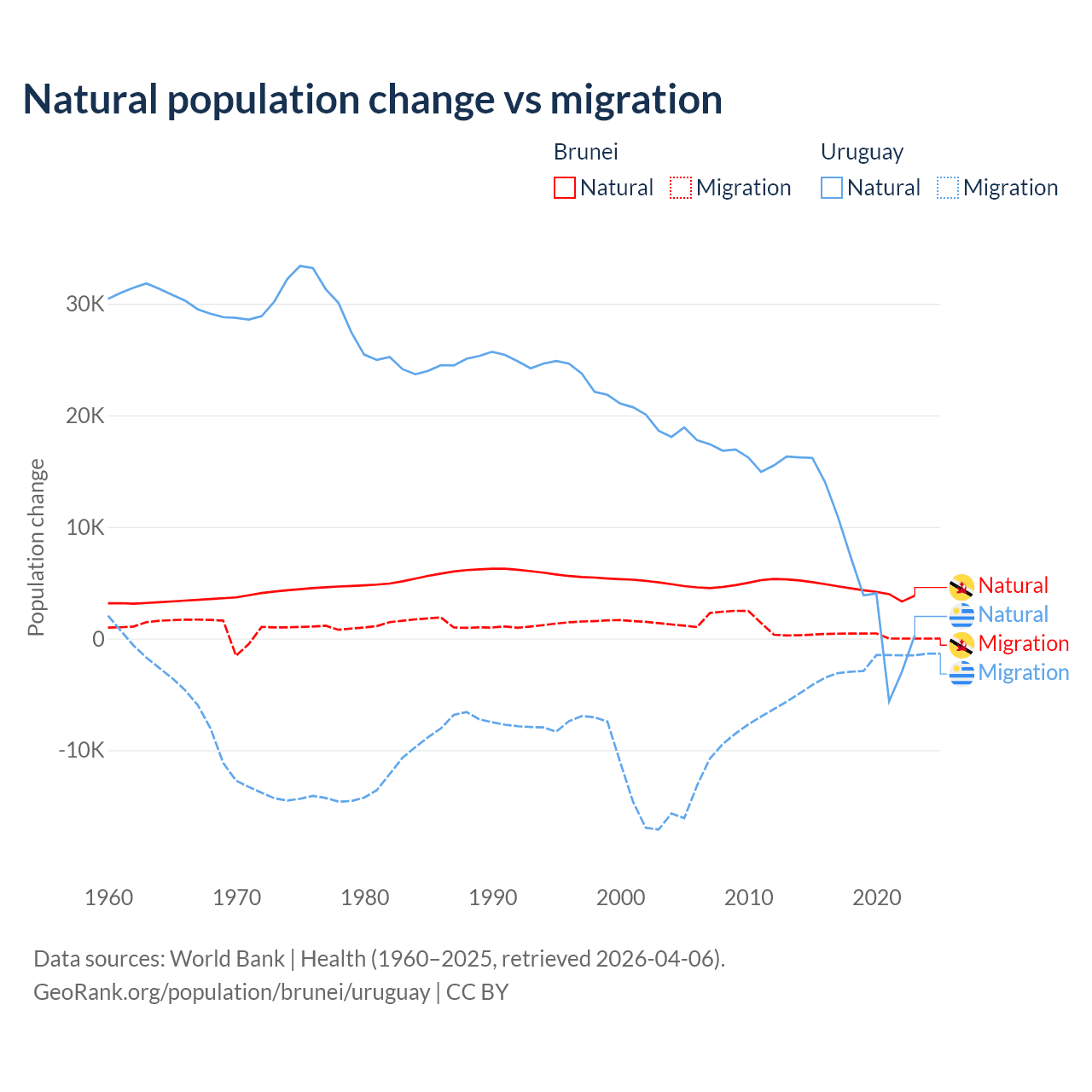 Over the last 10 years, 93.9% of the population change in Brunei is from natural causes (a gain of 43,993 people) and 6.15% is from migration (a gain of 2,882 people). In Uruguay 70% is from natural causes (a gain of 64,303 people) and 30% is from migration (a loss of 27,501 people).