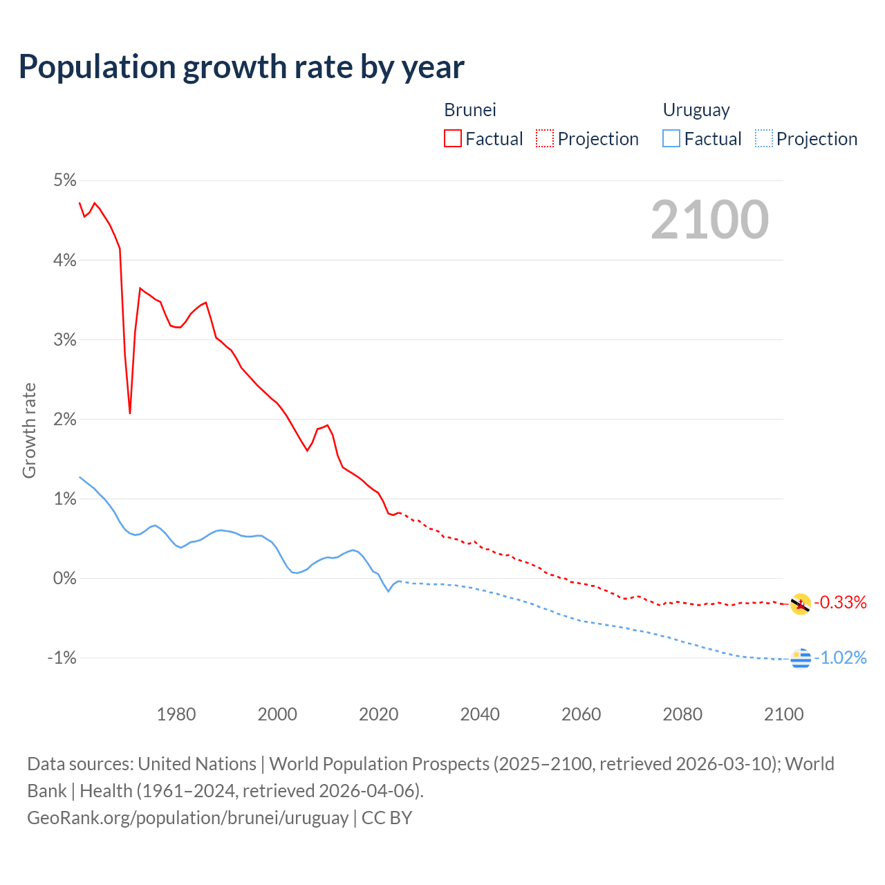 - For the last 10 years, Brunei has had an average growth rate of +1.08% per year vs +0.11% in Uruguay.