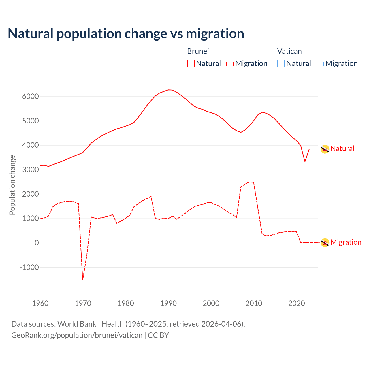 - For the last 10 years, Brunei has had an average growth rate of +1.08% per year vs +1.9% in the Vatican.