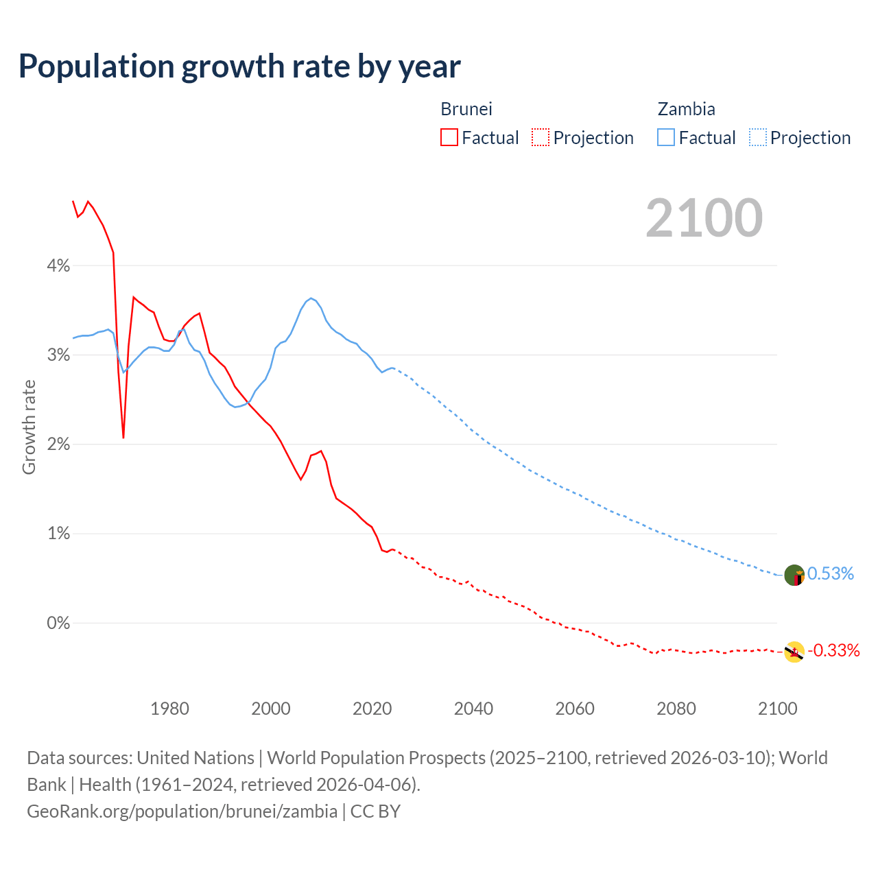 - For the last 10 years, Brunei has had an average growth rate of +1.08% per year vs +3% in Zambia.