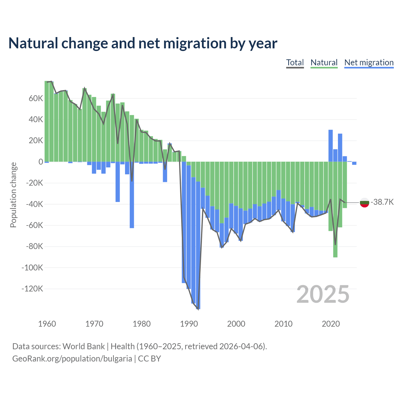 Over the last 10 years, 92.1% of the population change in Bulgaria is from natural causes (a loss of 528,535 people) and 7.94% is from migration (a gain of 45,567 people).