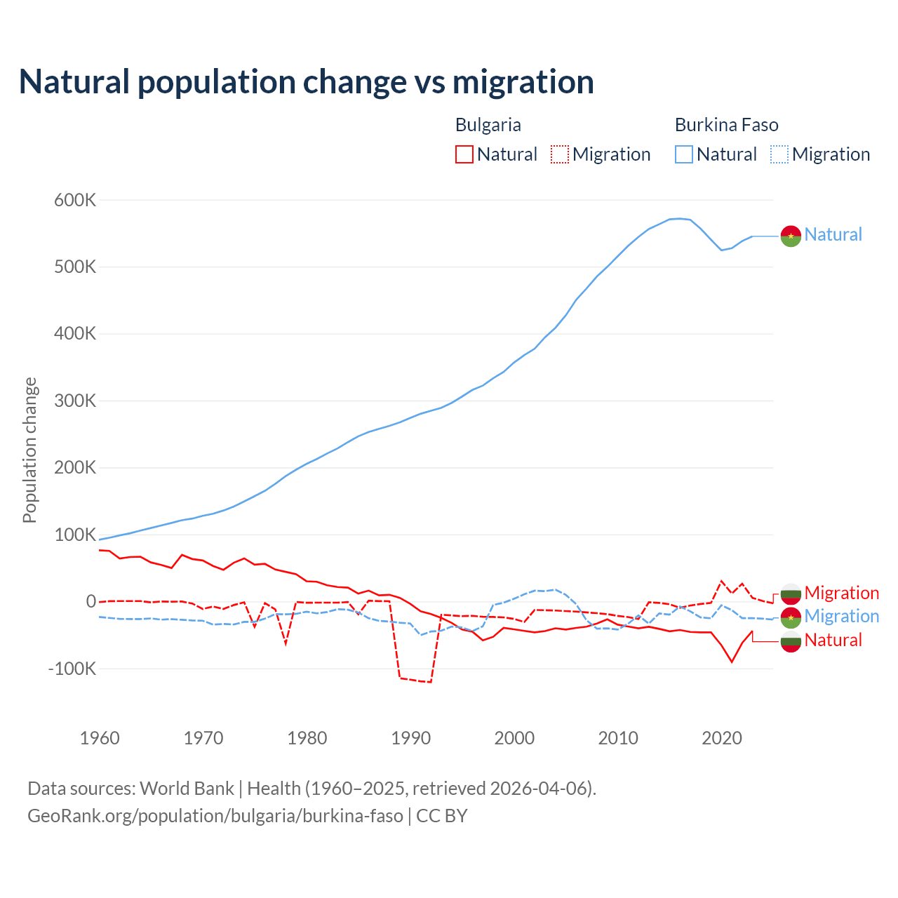 Over the last 10 years, 92.1% of the population change in Bulgaria is from natural causes (a loss of 528,535 people) and 7.94% is from migration (a gain of 45,567 people). In Burkina Faso 96.9% is from natural causes (a gain of 5,506,960 people) and 3.13% is from migration (a loss of 177,923 people).