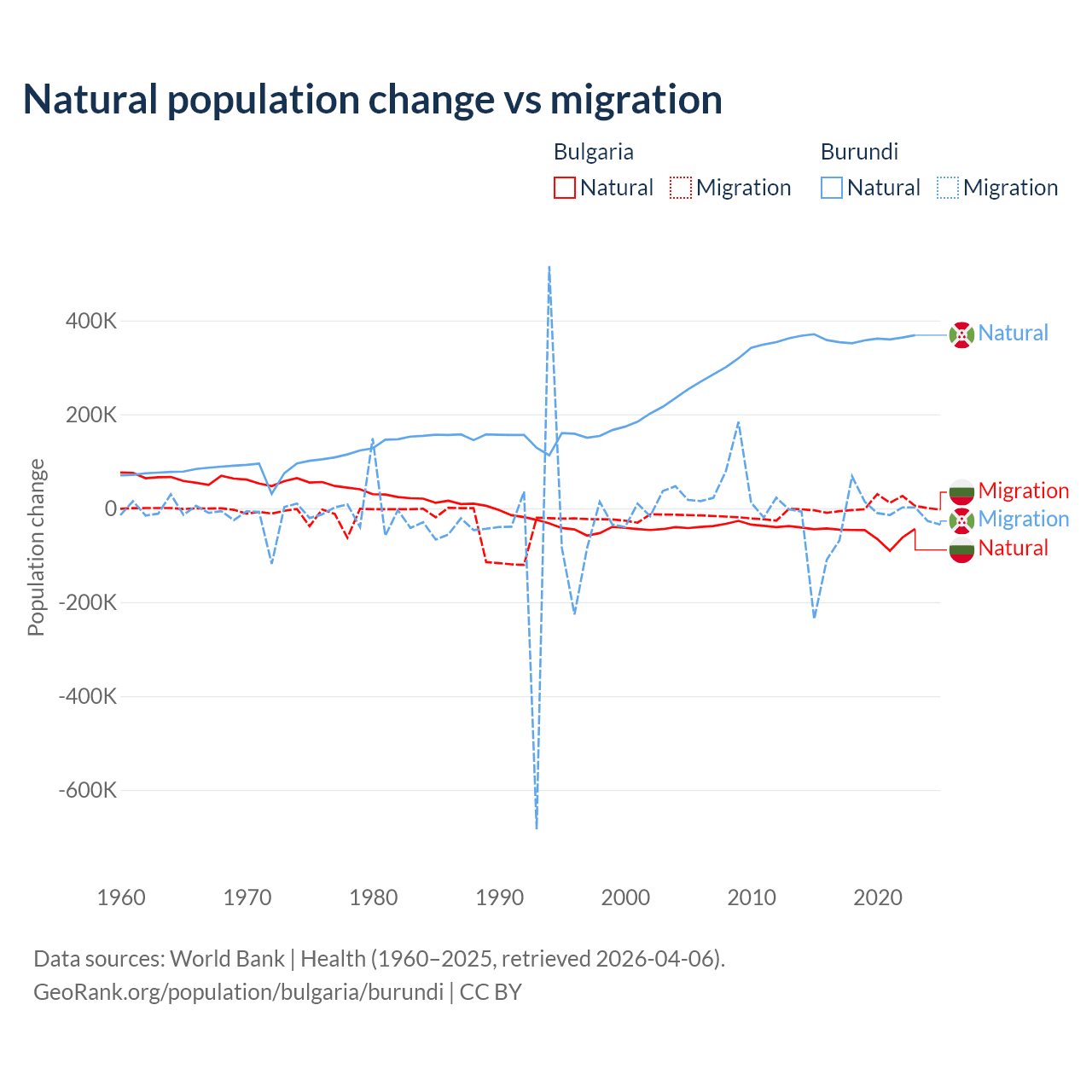 Over the last 10 years, 92.1% of the population change in Bulgaria is from natural causes (a loss of 528,535 people) and 7.94% is from migration (a gain of 45,567 people). In Burundi 91% is from natural causes (a gain of 3,614,502 people) and 9.03% is from migration (a loss of 358,928 people).