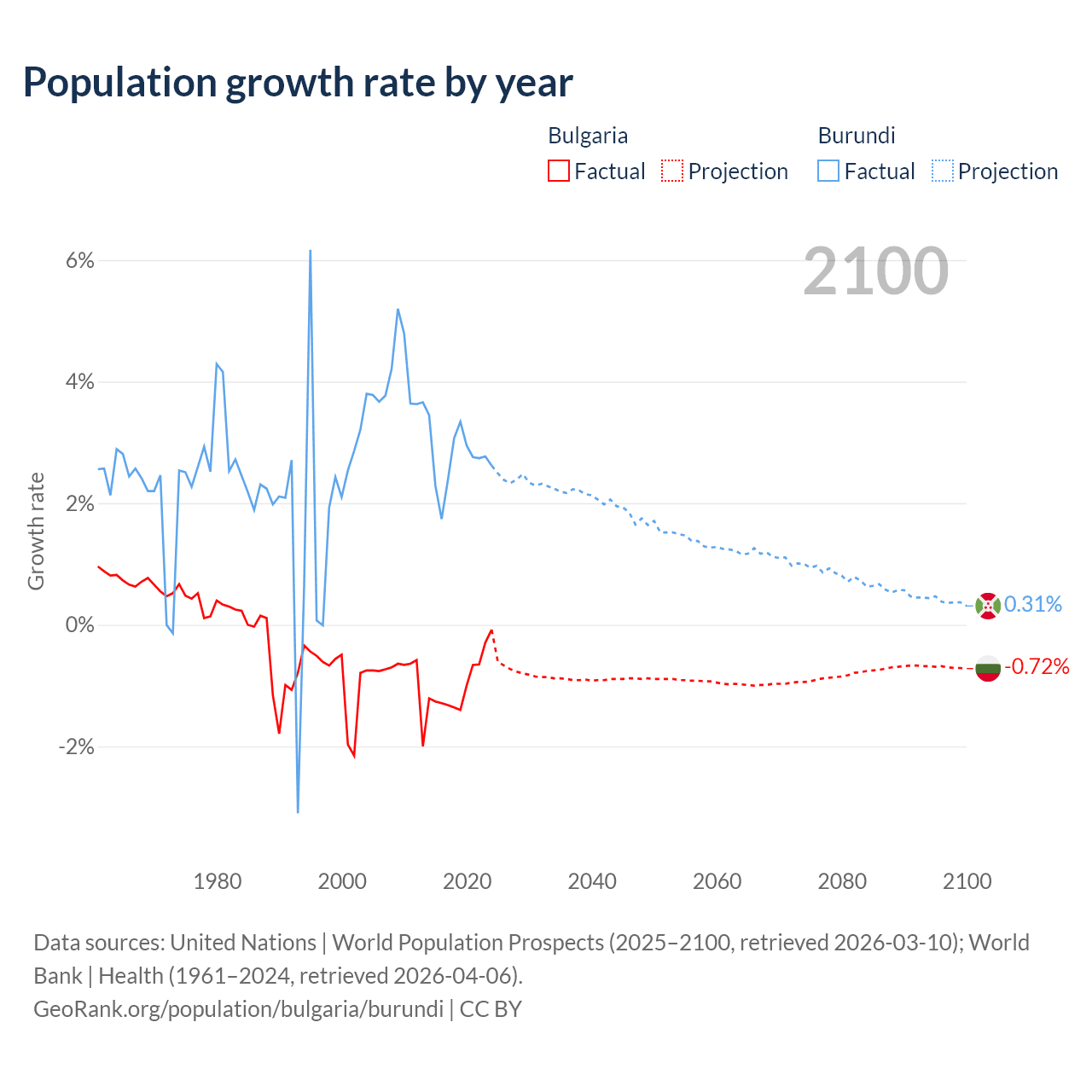 - For the last 10 years, Bulgaria has had an average growth rate of -0.96% per year vs +2.74% in Burundi.