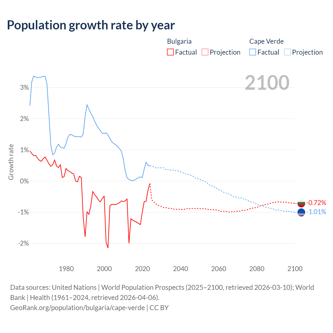 - For the last 10 years, Bulgaria has had an average growth rate of -0.96% per year vs +0.22% in Cape Verde.