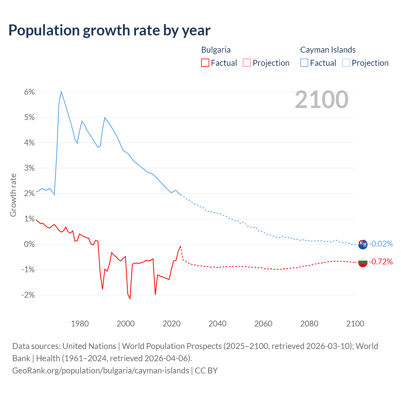 - For the last 10 years, Bulgaria has had an average growth rate of -0.96% per year vs +2.19% in the Cayman Islands.