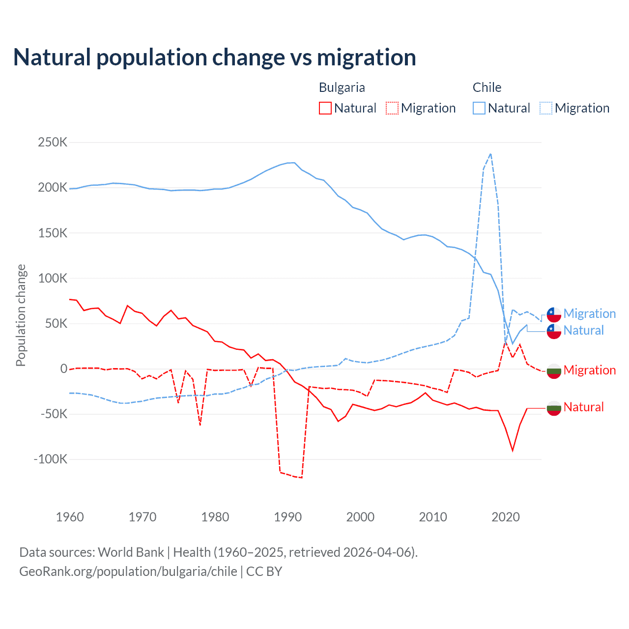 Over the last 10 years, 92.1% of the population change in Bulgaria is from natural causes (a loss of 528,535 people) and 7.94% is from migration (a gain of 45,567 people). In Chile 43.5% is from natural causes (a gain of 844,683 people) and 56.5% is from migration (a gain of 1,097,597 people).
