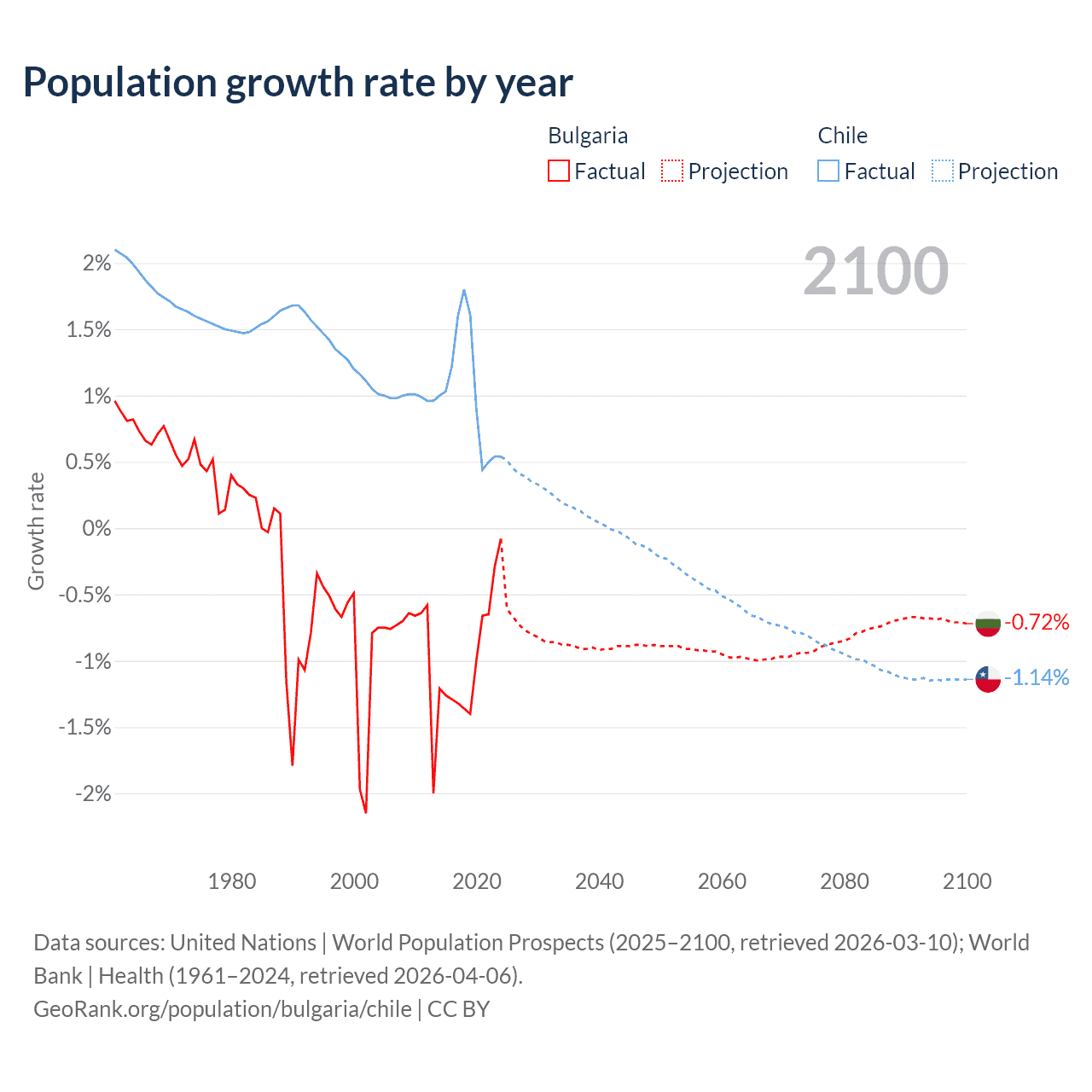 - For the last 10 years, Bulgaria has had an average growth rate of -0.96% per year vs +1.02% in Chile.